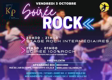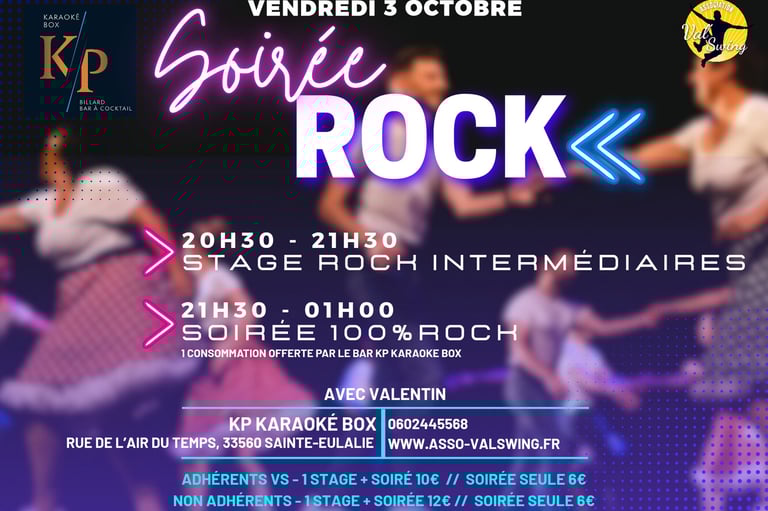 L’association Val’Swing vous convie à une soirée exceptionnelle dédiée au Rock le vendredi 03 octobre à partir de 20h30, au KP KARAOKE BOX